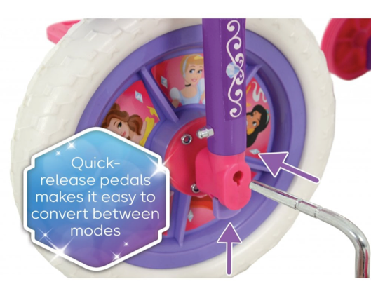 Age range: 2 years upwards; 10 inch lightweight wheels with puncture proof tyres; Front mudguard; Removable pedals and stabilisers; Adjustable handlebar height 61-63 cm; Adjustable seat height 41-46 cm; Lovely Disneys graphics and character plaque; Frame: Steel