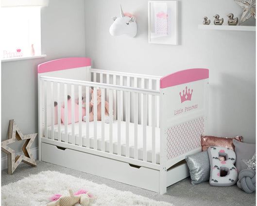 Balancing simplicity and style with a selection of valuable features, the Inspired range of cot beds are the perfect option for parents wanting to add a splash of colour and unique designs to little one’s first room. The Little Princess cot bed will make your young princess feel like real royalty featuring royal inspired designs and pink end tops. Features an adjustable three-position base, the top setting allows your little one to be taken in and out of the cot bed without unnecessary bending, then as your child learns to sit and stand you can adjust the base by a further two positions and the presence of teething rails ensure your little ones delicate first teeth are protected at all times. Once your little one is ready to progress to a bed, this cot bed can convert seamlessly from a cot bed into a cosy and stylish junior bed, meaning it offers maximum durability and great value from birth up to approximately four years.