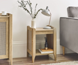 Showcasing a beautifully sleek design with a bohemian feel, the Saige Lamp Table offers exquisitely curved edging accompanied by a raised lip around the edge providing a practical addition, stunningly combined with a rattan-styled front. Finished with a natural oak effect featuring a removable shelf allowing you to store key essentials both on the top and bottom of the table. All around creating the perfect airy, warm feel within your home.